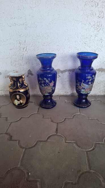 Şüşə dekorativ vazalar – 2 ədəd 1) Kobalt-mavi və qızılı tonlarda, iri dekorativ vaza - Material: qalın şüşə - Rənglər: kobalt-mavi fon, güclü qızılı örtük - Bəzək: əl işi tərzli relyef çiçək naxı...