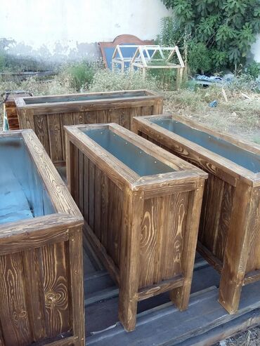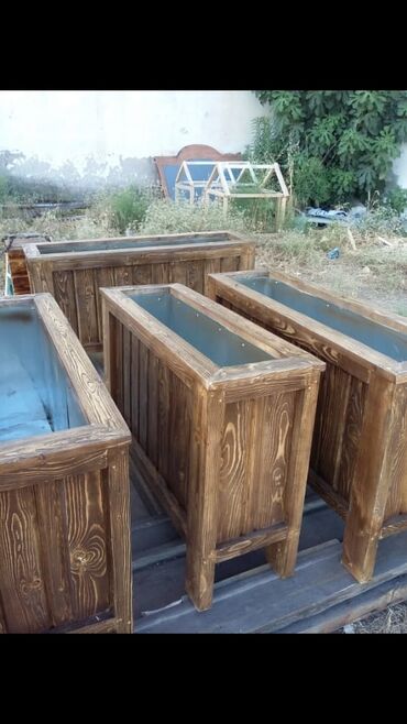 Açıq havaya uyğun dekorativ taxta gülbəçələr - Material: təbii ağacdan yığma konstruksiya, iç tərəfi suya davamlı örtük/plyonka ilə izolyasiya olunub. - Rənglər: qəhvəyi (ağac teksturalı), ağ, qar...