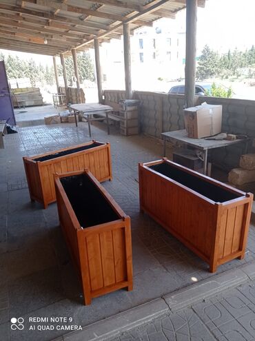 Açıq havaya uyğun dekorativ taxta gülbəçələr - Material: təbii ağacdan yığma konstruksiya, iç tərəfi suya davamlı örtük/plyonka ilə izolyasiya olunub. - Rənglər: qəhvəyi (ağac teksturalı), ağ, qar...
