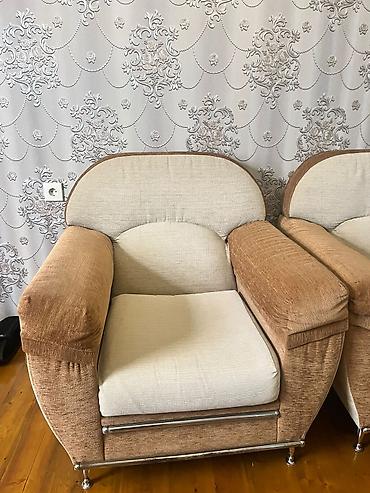 Divan ve 2 kreslo 200manat - Rəng: qəhvəyi/bej tonları - Material: yumşaq parça örtük - Dizayn: qara rəngli, dekorativ xrom xəttlərlə vurğulanmış taxta qol dayaqları - Divan: 3 nəfərlik oturacaq, ...