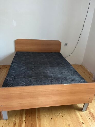 - Çarpayı: Taxta fakturalı karkas (işıq qəhvəyi), sadə düzbucaqlı başlıq və ayaqlıq. Stabil metal ayaqlar. Üstündə tünd boz naxışlı döşək yerləşdirilib. Yataq otaqları üçün kompakt ölçülü.