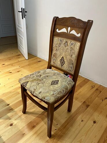 - Stul: Qəhvəyi rəngli ağac karkas, arxa hissəsində dekorativ oymalar. Oturacaq və söykənəcək qızılı-bej naxışlı parça ilə üzlənib. Klasik üslub, yemək otağı və qonaq otağı üçün uyğundur.