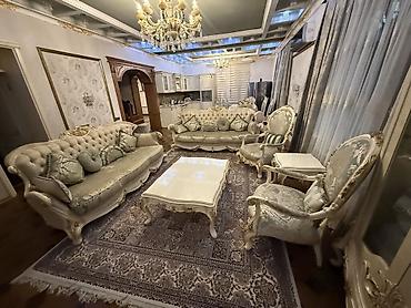 Klassik üslubda qonaq otağı dəsti Tərkibi: - 3 nəfərlik divan, 2 ədəd kreslo – oyma dekorlu, yumşaq relyefli arxa hissə, klassik krujeva kənarlı örtüklər, dekorativ yastıqlar - Yemək masası və 6 ə...