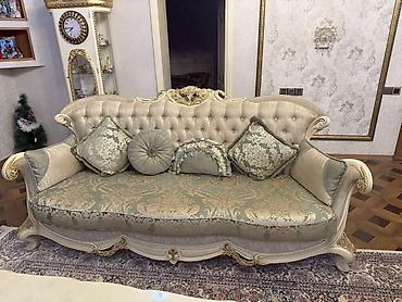 Klassik üslubda salon mebeli dəsti - Tərkib: 3 nəfərlik divan, 1 ədəd iri kreslo, dekorativ yastıqlar - Rəng: krem/ağ tonları - Üslub: barok/klassik - İstifadə yeri: qonaq otağı, salon, resepsiy...