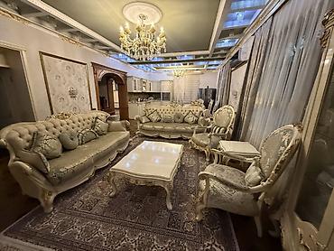 Klassik dəst: zərif qızılı oyma çərçivəli salon mebelləri - Dəstə daxildir: 1 üçnəfərlik divan, 2 ədəd kreslo, 1 iri dekorativ jurnal masası, 2 ədəd yan stol, dekor yastıqlar. - Dizayn: Barok/roko...