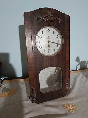 - Retro taxta divar saatı: laklı taxta korpus, oyma bəzək elementləri, yuxarıda dairəvi siferblat, aşağı hissədə şüşəli pəncərə. Saat mexaniki qurğulu, yelləncəkli konstruksiyaya malikdir.