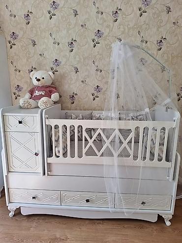 - Beşik-komod kombinasiyası: yan tərəfdə çekmecəli və qapılı bölmə, aşağı hissədə 3 böyük çekmece. Beşiyin ön tərəfi sürüşən bariyerlə təchiz olunub. Üst hissədə cib-kanopi üçün dayaqlı tül seti görünür. Daxilində yastıq və qoruyucu bortlar üçün yer uyğundur.