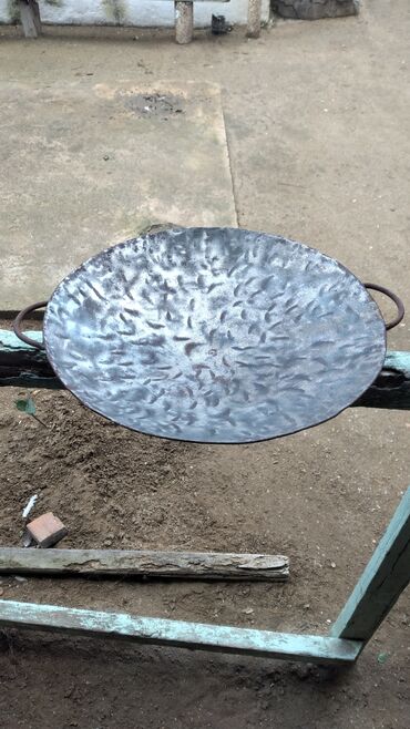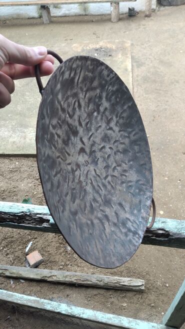 Dəmir saçaq və qapaq dəsti - Material: qalın döymə dəmir - Komplekt: geniş, yastı-saçaq tava və uyğun metal qapaq - Tutacaqlar: iki yan qulp (tavanın hər iki tərəfində) və qapaqda mərkəzi halqa - ...