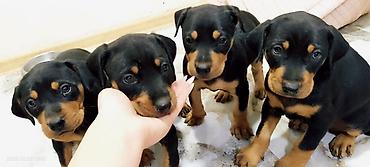 Şəkildə gördüyünüz Doberman balaları satılır. Cəmi 4dənə bala var. Dişi balalar mövcuddur. Qiymət: 150AZN (077-513-66-45). Əgər almaqda ciddisinizsə, əvvəlcədən beh atılmalıdır. İstəyənlər bu nömrə ilə əlaqə saxlasın.