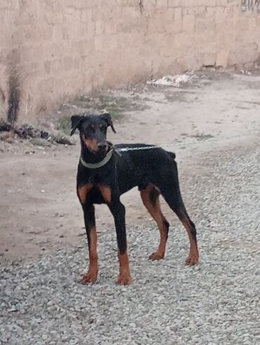 Satılır: Doberman • Cins: Doberman Pinscher • Rəng: Qara-qəhvəyi (tan işarələr) • Quylu qulaqlar, möhkəm bədən quruluşu • Aktiv, çevik və ayıq mühafizə instinkti • Həyətyanı sahə və mühafi...