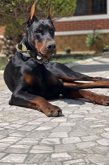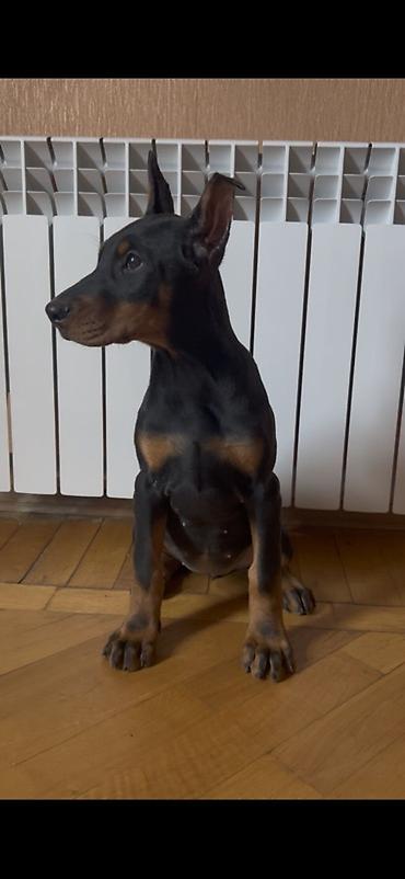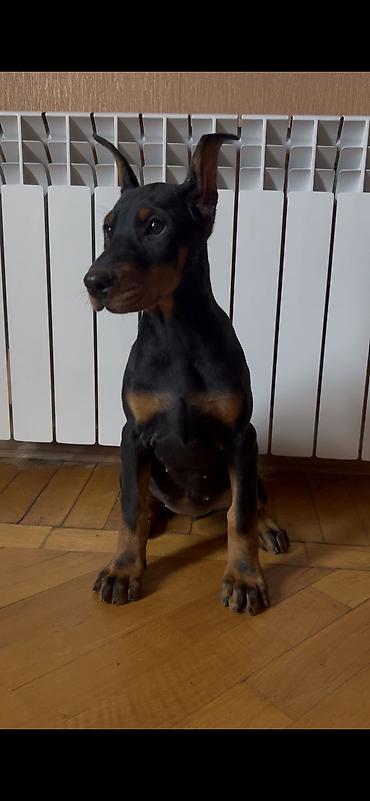 Saf qanlı Doberman Pinscher balası. Xüsusiyyətlər: - Rəng: qara/qəhvəyi (tan işarələr) - Cinsəxas atletik quruluş, güclü skelet və ifadəli baş - Qulaqlar formaya gətirilib; quyruq təbii - Aktiv, ç...