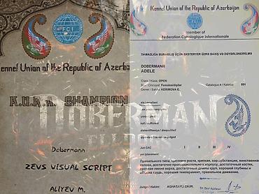 Doberman pinscher balaları 5 dişi bala 3 aylıqdır . Quru yemək və ət yeyirlər - Rəng: qara-tan (qara üstündə açıq qəhvəyi işarələr) - Ana və bala fotolarda göstərilib; ata saf qan doberman, atl...