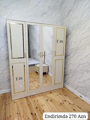4 qapılı paltar şkafı - Klassik dizayn: krem rəngli korpus, qızılı dekor xətləri və qızılı halqa tutacaqlar - Orta hissədə 2 ədəd tam ölçülü güzgü qapı - Ayaqlı konstruksiya, qızılı rəngli ayaq uc...