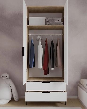 İki qapılı garderob şkaf - Rəng və dizayn: Ön hissə ağ, yan və alt hissələr ağ-qəhvəyi taxta teksturası ilə. Minimalist tutacaqlar. - Quruluş: 2 qapı + 2 alt çekmece. Üst hissədə asılqan bölməsi v...