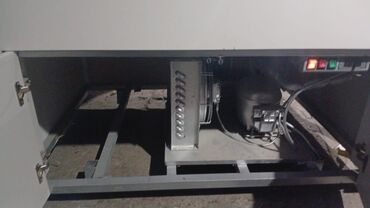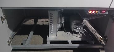 - Alt hissədə texniki bölmə: kompressor, kondensator-buxarlandırıcı blok, fan, idarəetmə paneli (On/Off, işıqlandırma və soyutma düymələri görünür).