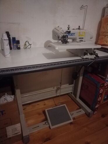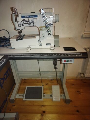 - 1) DOTT Interlock sənaye tikiş maşını: çoxiynəli, interlok tikişi üçün. Trikotaj və elastik parçalarda yan tikiş, ətək, büzmə və örtücü tikişlərə uyğun. Üst hissədə çoxsaplı iplik keçid sistemi, gərginlik tənzimləyiciləri və təhlükəsizlik nişanlaması. Pedallı idarəetmə, zəncir ötürücüsü, sürətə həssas reostat, ön paneldə start/stop düymələri. Geniş iş masası ölçü cızğıları ilə, möhkəm metal karkas, iplik üçün dayaq və rulon tutacaqları.