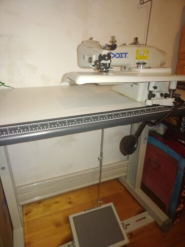 - 2) DOTT sənaye birbaşa tikiş maşını (düz tikiş): universal istifadə üçün. Stabil platforma, böyük iş sahəsi, pedalla idarəetmə, iplik dayağı, masaya inteqrə olunan ölçü xətkeşi. Qalın və incə parçalarla işləmək üçün basqı ayağı və sap gərginliyinin tənzimlənməsi.