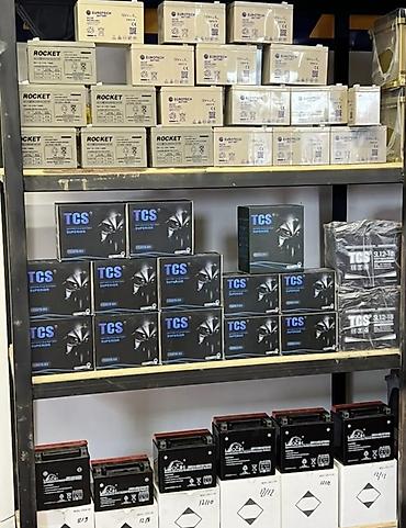 - Digər rəflərdə 12V silsiləli VRLA/AGM akkumulyatorlar (müxtəlif Ah dəyərləri göstərilib).