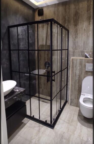 - Dizaynlar: loft/industrial qara profilli çərçivələr, şüşədə dekorativ xəttli mat naxış, tam şəffaf şüşəli 5 və 6 guşəli kabin variantları.