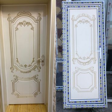 - Qapı panelləri: Klassik ornamentli, krem rəng tonlarında dekorativ interyer qapı lövhələri. Reli̇ef naxışlar, zərif qızılı konturlar, müxtəlif ölçülərə tətbiq oluna bilən panel konstruksiyası.