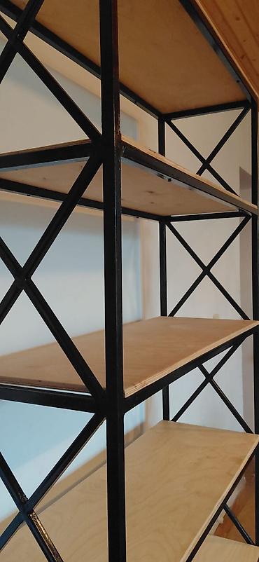 Metall çərçivəli loft üslubunda rəf sistemi - Dizayn: Asimmetrik, pilləli kompozisiya; açıq karkas konstruksiya. Otağa yüngül və müasir görünüş qatır. - Material: Qara metal karkas + açıq rəngli t...