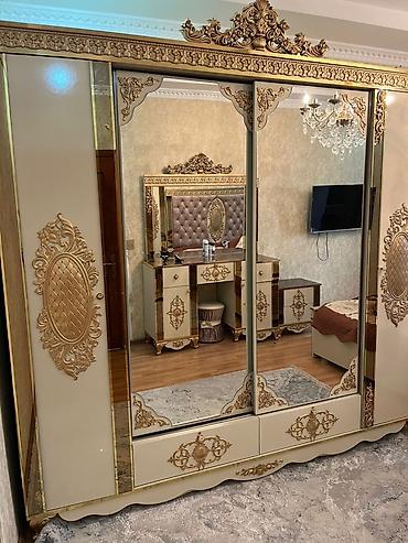 - 3 qapılı, güzgülü qarderob – sürüşkən qapılar, üst hissədə oyma qızılı ornament, alt bölmədə əlavə çekmecələr. Daxildə asılqan bölməsi və rəflər.