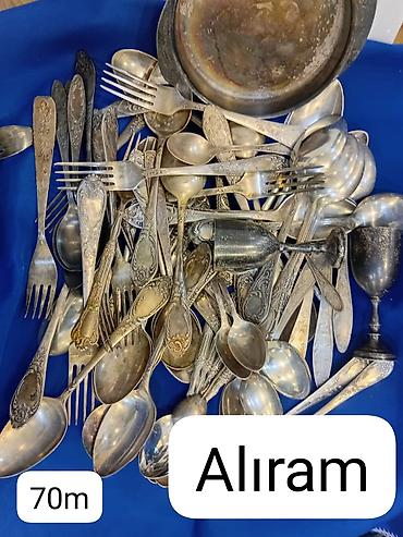 - Gümüş çəngəl, qaşıq, bıçaq və digər süfrə ləvazimatları (klassik naxışlı, müxtəlif ölçülərdə). Şəkildə çəkidən asılı qiymət qeyd olunub: 70 m.