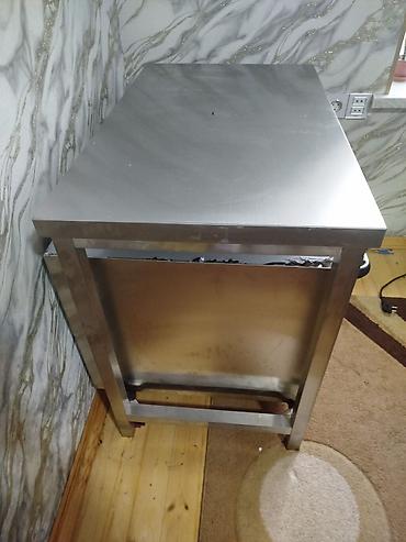 - Paslanmayan polad iş masası – möhkəm üst panel, sabit karkas, alt dayaqlarla.