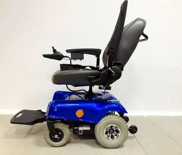 Elektrikli əlil arabası - Rəng: mavi-qarışıq çərçivə, mavi oturacaq və arxa hissə - İdarəetmə: sağ qoltuqaltında joystick paneli (sürət və istiqamət üçün) - Güc bloku: alt hissədə akkumulyator böl...