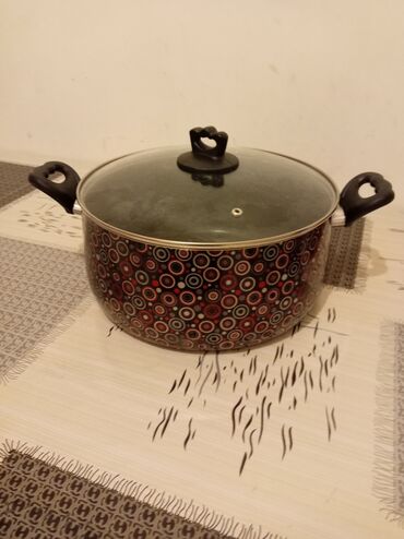 Mətbəx və dekor dəsti - 5 ədəd emallı qazan seti – ağ rəngdə, hərəsinin üzərində qızılgül naxışları. Hər qazanın yanlarda iki ədəd tutacağı, üstündə şüşə/qapaq (metallı kənarlı) var. Fərqli ölçülə...