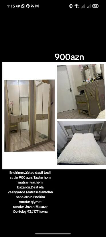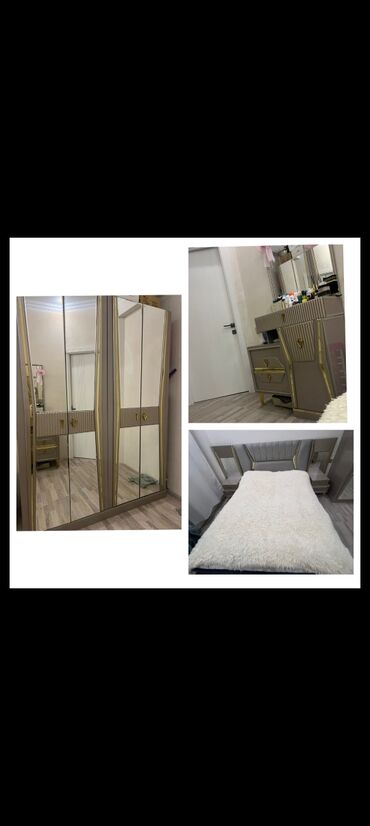 Yataq otağı dəsti – klassik və zərif dizayn Tərkibi: - Çarpayı (yumşaq başlıq, qızılı detallar) - 2 ədəd tumba - Güzgülü makiyaj/komod masası (çekmece və dolab bölməsi ilə) - 4 qapılı şkaf: orta h...