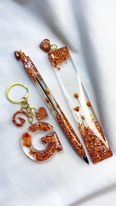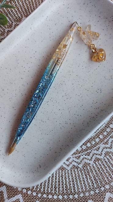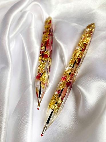 - Şəffaf epoksid materialdan hazırlanmış, daxilində qızılı folqa, qırmızı ləçəklər, mavi parıltılar və xırda dekorlar yerləşdirilmiş dekorativ qələmlər.