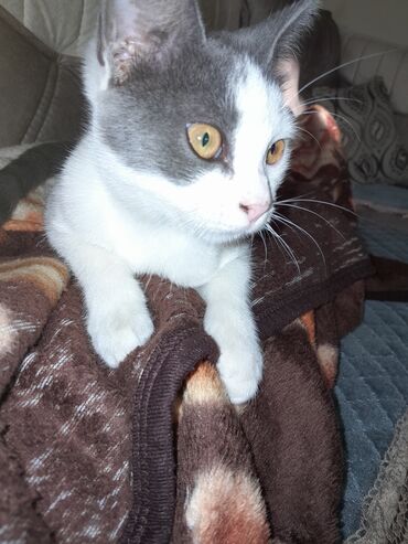 Boz-ağ rəngli ev pişiyi - Qısa tüklü, zərif və ahəngdar bədən quruluşu - Boz kürk, sinə və burun hissəsində ağ naxış, ağ pəncələr - Sarımtıl-golden gözlər, çənəaltı və bığ hissəsi ağ - Yaşıl rəngl...
