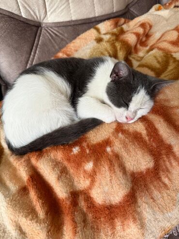 Məhsul: Ev pişiyi - Cins: Qarışıq (tabby-ağ rənglərlə) - Rəng və xəz: Boz-qəhvəyi zolaqlı kürk, sinə və pəncələrdə tam ağ, burnu açıq çəhrayı. Orta uzunluqda yumşaq xəz. - Gözlər: Açıq yaşıl/sarı ...