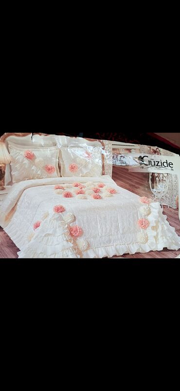 Geyizce Home Textile – Yataq Örtüsü Dəsti (GULFEM) Məzmun: - Yataq örtüsü: 260 x 260 sm (1 ədəd) - Yastıq üzlüyü: 50 x 70 sm (2 ədəd) - Bəzək yastığı: 50 x 50 sm (1 ədəd) Xüsusiyyətlər: - Zərif k...
