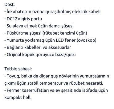 - Toyuq və digər quş növlərinin yumurtalarının çıxımı üçün sabit temperatur və rütubət nəzarəti