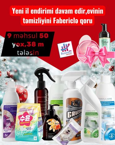 - Ev üçün təmizlik və yuma vasitələri: qab yuma gəli, çoxməqsədli sprey, tualet təmizləyici gel-konsentrat, soda əsaslı təmizləyici, ultrabəyazlaşdırıcı/otaq təmizləyicisi, paltar yuma tozu-konsentratı, əl üçün krem-sabun, ətirli məişət spreyləri və s. Yeni il endirimi bannerində qeyd: “9 məhsul 50 yox, 38 m”.