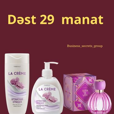 • La Crème “Aromatik Orxideya” – duş üçün krem-gel, maye krem-sabun, FESTA DI VITA ətiri. Banner: “Dəst 29 manat”.