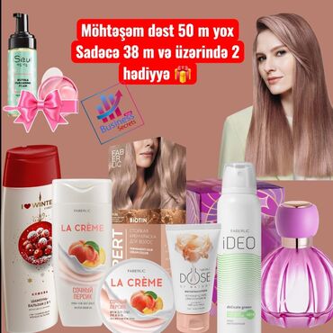 • Geniş qarışıq gözəllik paketi: ISeul köpük təmizləyici, I Love Winter 2‑si‑1‑də şampun‑balzam, La Crème şaftalı seriyası (duş geli və bədən kremi), Expert Biotin saç boyası, Dose of Nature əl kremi, iDEO dezodorant (delicate green), bənövşəyi flakonlu qadın ətiri. Banner: “Möhtəşəm dəst 50 m yox, sadəcə 38 m və üzərində 2 hədiyyə”.