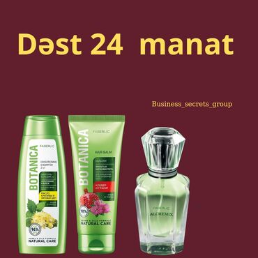 • Botanica – 2‑si‑1‑də kondisionerli şampun, saç balzami (yonca və nar ekstraktları), Faberlic Alchemix ətiri. Banner: “Dəst 24 manat”.