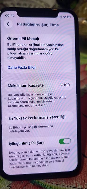 - Batareya: Telefonun “Pil Sağlığı və Şarj Etmə” bölməsində maksimum tutum 100% göstərilir. Sistemdə “Bu iPhone’un orijinal bir Apple pilinə sahib olduğu doğrulanamıyor” bildirişi var. İyileştirilmiş Pil Şarjı funksiyası aktivdir.