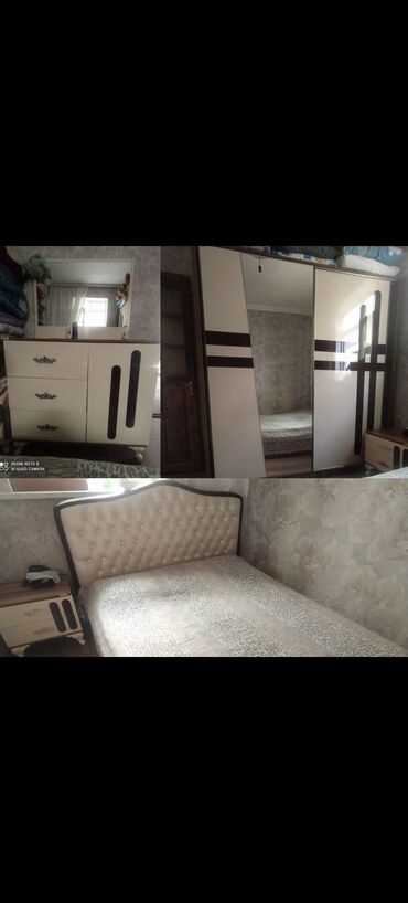 Müasir dizaynlı yataq otağı mebel dəsti Tərkib: - Geniş çarpayı: yumşaq panel başlıq, ağ-beton teksturalı və ağ korpus, taxta dekor elementləri. - 3 qapılı qarderob: mərkəzdə tam boy güzgü panellə...