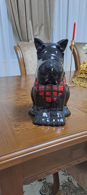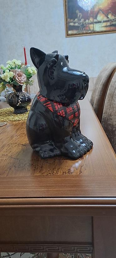 Böyük ölçülü dekorativ it heykəli - Material: keramika/porşelen tipli parlaq şir ilə örtülmüş - Rəng: qara-qəhvəyi tonlarda, realist detallı - Forma: oturan vəziyyətdə, dik qulaqlar, ifadəli üz ci...