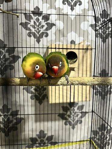 Məhsul: Sevgi papağanları (Agapornis) Təsvir: - Rəngarəng sevgi papağanları: mavi-yaşıl gövdəli, qara başlı ağ halqalı; həmçinin sarı-yaşıl və narıncı-sarı rəng mutasiyaları. - Qəfəsdə qrup halınd...