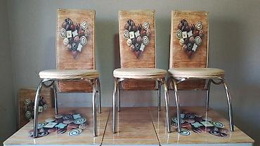 - Dizayn: Taxta teksturalı səth üzərində şokolad/konfet temalı naxış; stulların arxa hissəsi eyni printlə uyğundur