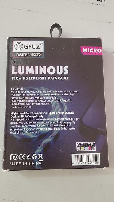 Sürətli enerji yükləmə və etibarlı məlumat ötürülməsi üçün dekorativ LED işıqlandırmalı Micro USB kabeli. Made in China.