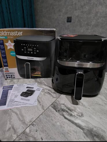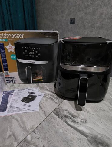 Goldmaster hava-fritözü - Markası: Goldmaster - Korpus: paslanməz polad və qara parlaq panel - Çıxarılan səbət və iç qəfəs: yapışmayan səth, asan yuyulan - Səbət tutumu: geniş kvadrat formalı səbə...