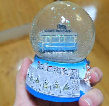 - Şüşə kürə içində mavi tramvay fiquru, qar və xırda parıltılarla
