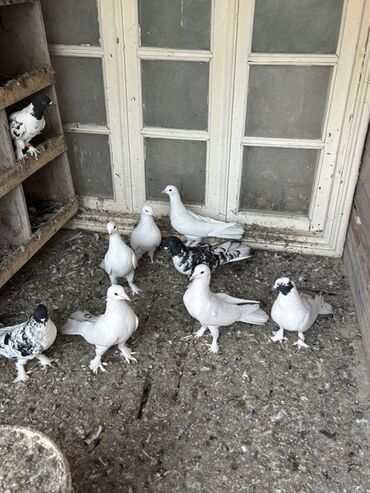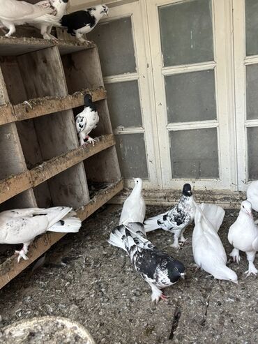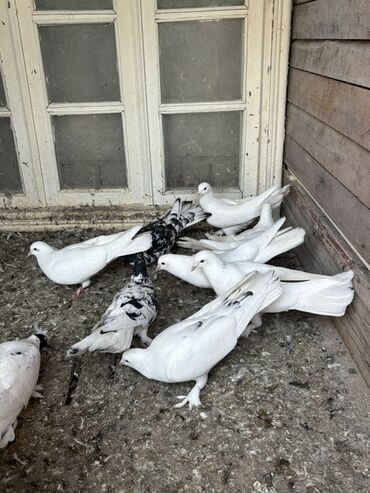 - Şəkillərdə müxtəlif rəngdə və naxışda ev göyərçinləri görünür: tam ağ, ağ-qara, qara-ağ ləkəli və az miqdarda krem çalarları olan quşlar.