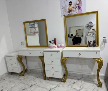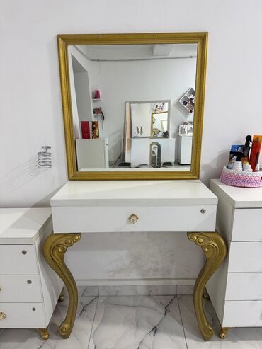 Salon güzgüsü və makiyaj masası - Böyük ölçülü güzgü, qızılı çərçivə ilə - Aşağıda 4 çekmecəli ağ masa (iki tərəfdə 2-dən) – aksesuar və ləvazimatlar üçün geniş saxlama - Üst hissə: lazer kəsimli ...